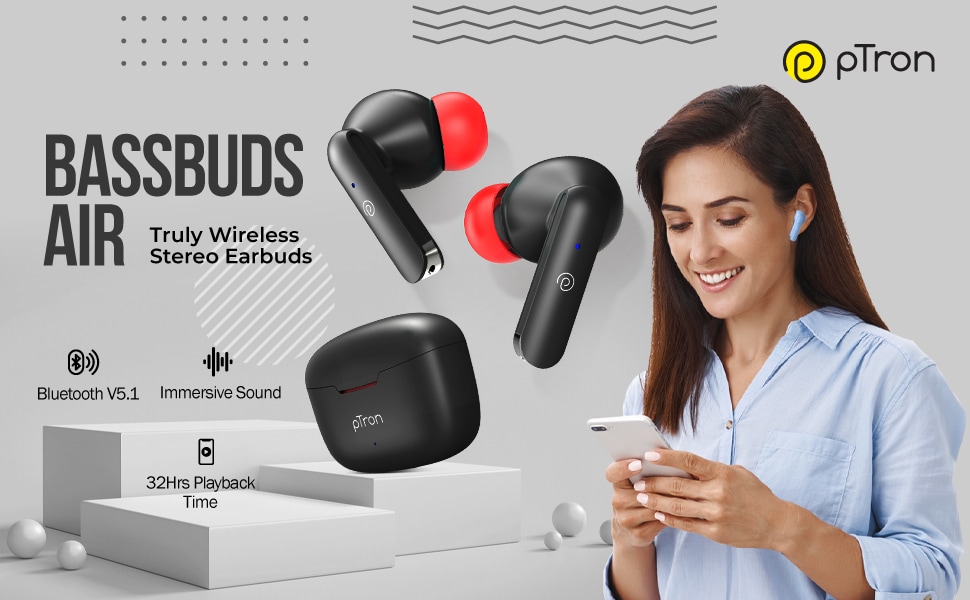 pTron True Wireless Bassbuds Air Bluetooth Headphones, Upto 32 Hours of Playtime, 13 mm Dynamic Drivers, Built-In Dual HD Mic, Bluetooth v5.1, Quick Connect , Touch Control, Voice Assistant Support, Type-C Fast Charging, Black Matt