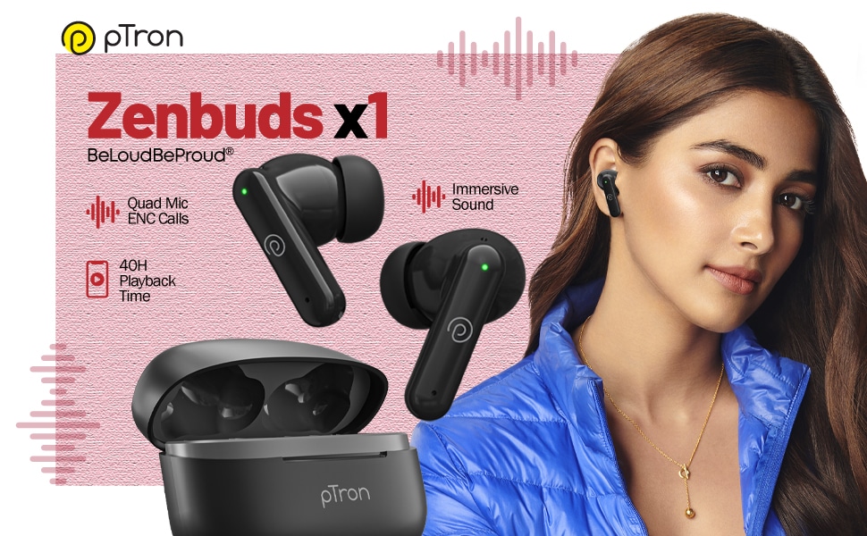 pTron Zenbuds X1 Quad Mic TWS Earbuds, Black, TruTalk ENC Calls, 40 Hours Playtime, In Ear Sensor, 40 ms Movie and Music Modes, Headphones, Type C Fast Charging IPX5