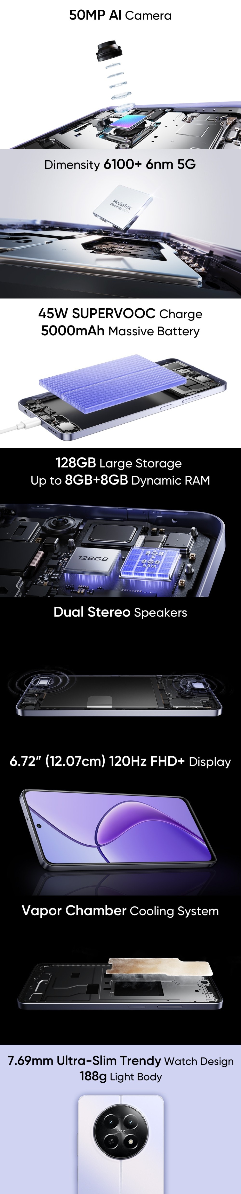 | Key Features | Processor: Dimensity 6100 Plus, Octa Core, 2.2 GHz Internal Storage: 128 GB, RAM: 4 GB Battery Capacity: 5000 mAh Quick Charger: 45 Watts Fast Charging Display Type: 6.72 inches, 1080 x 2400 px, IPS LCD 120 Hz HD with Punch Hole Rear Camera: 50 MP + 2 MP Front Camera: 8 MP Memory: Memory Card Supported, Upto 2 TB Sensors: Geo-magnetic, Light Sensor, Distance Sensor, Acceleration Sensor Fingerprint Recognition: Side Fingerprint Sensor SIM: Dual SIM, 3G, 4G, 5G, VoLTE, Wi-Fi, NFC |