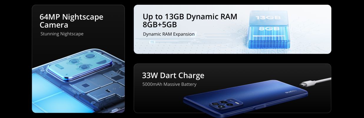 | Key Features | 16.5cm (6.5 inch) FHD+ 90Hz Ultra Smooth Display 6nm Dimensity 810 5G Processor, 33W Dart Charge realme UI 2.0 Based on Android 11 Operating System 64 MP + 2 MP + 2MP Primary Camera 16 MP In-display Selfie Camera, Next-Gen 5G Network 5000 mAh Massive Battery, Extra 5GB Virtual RAM |