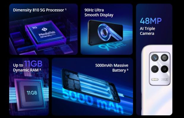 | Key Features | 16.51 cm (6.5 inch) 90Hz Ultra Smooth Display Dimensity 810 5G Processor realme UI 2.0 based on Android 11 Operating System 48 MP AI Triple Primary Camera 16 MP Selfie Camera 5000 mAh Massive Battery Additional 5 GB Virtual RAM |