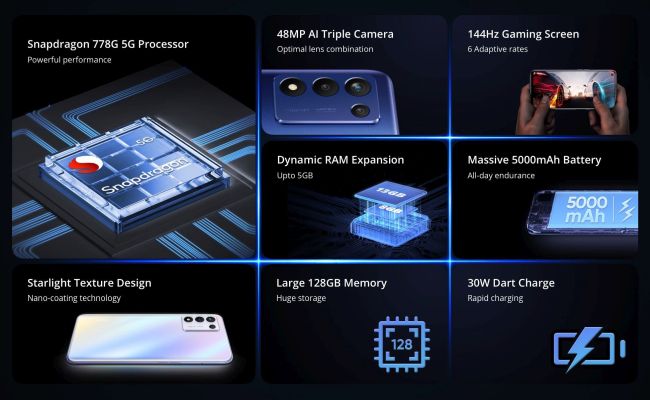 | Key Features | 16.76 cm (6.6 inch) 144Hz Full HD+ Display Rear Camera: 48MP + 2MP + 2MP AI Triple Camera Front Camera: 16 MP 30 Watts Dart charge, 5000 mAh Massive battery Side mounted fingerprint sensor Qualcomm Snapdragon 778G 5G processor Internal storage can be used as RAM Realme UI 2.0 Android version 11 OS |