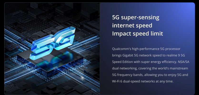 Qualcomm Snapdragon 778G 5G Processor, composed of kyro 670 CPU and Adreno 642L GPU with souring performance, advance 9nm process, newly upgraded 6th generation A1 engine, excellent Spectra 570L triple ISP, strong combination brings unprecendented performance to realme 9 5G speed edition.