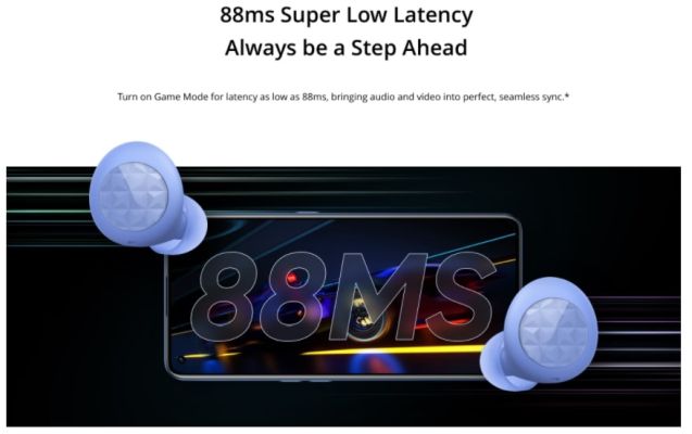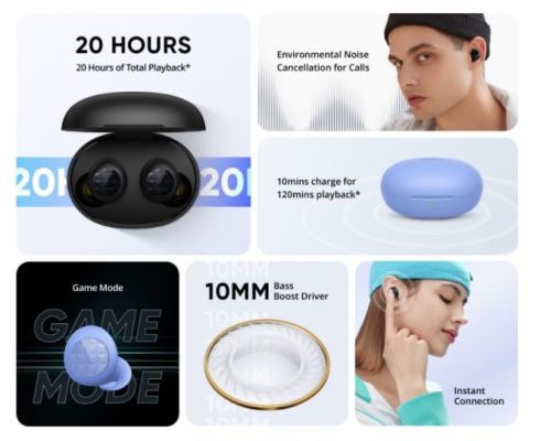 | Key Features | Up to 20 hours of Total Playback 88 ms Super Low Latency 10 mm Bass Boost Driver Realme Link App Support IPX4 Sweat and Water Resistant Environment Noise Cancellation for Calls 10 mins charge for 120 mins Playback Game Mode, Instant Connection |