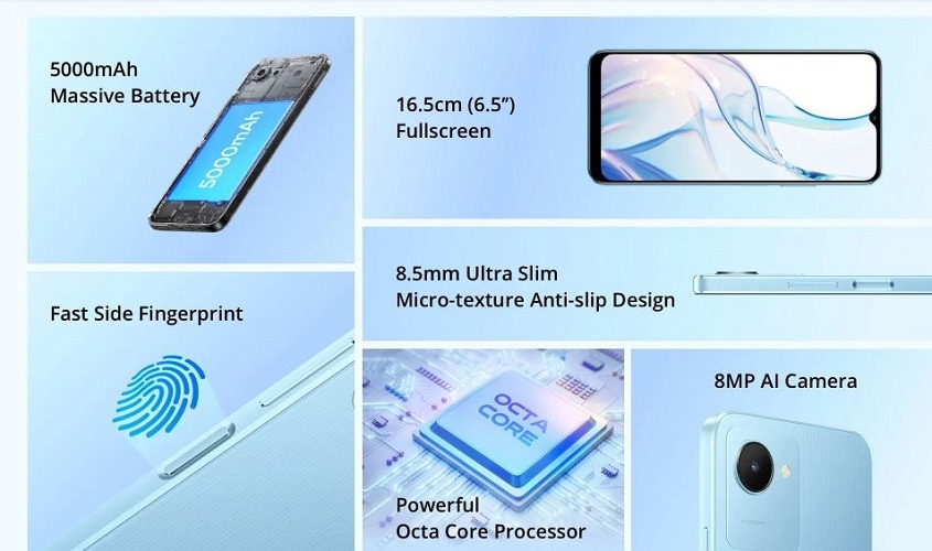 | Key Features | Display: 16.5 cm (6.5 Inch) Fullscreen Back Camera: 8 MP AI Front Camera: 5 MP AI Battery: 5000 mAh Internal Storage Memory: 32 GB + 2 GB |