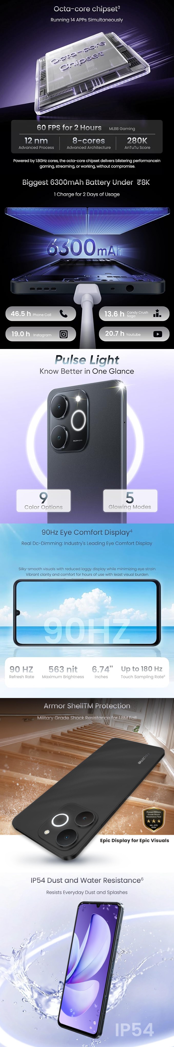 - Battery: 6300 mAh, 15 Watts Charging