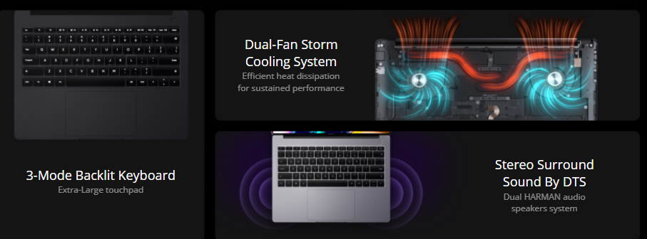 realme Book is equipped with a dual HARMAN high-resolution audio speaker system that reproduces accurate stereo sound to bring you a more immersive audio experience. DTS Stereo Surround Sound enables you to fully enjoy dramatic all-around cinema-like sound without distortion. Music, movies, and games all become highly immersive audio experiences.