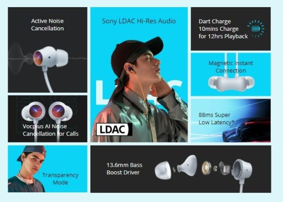 | Key Features | Active Noise Cancellation Sony LDAC Hi-Res Audio 88ms Super Low Latency Transparency Mode 13.6mm Bass Boost Driver Magnetic Instant Connection IPX5 Sweat and Water Resistant Bass Boost+ bass enhancement solution Dart Charge 10mins Charge for 12 hours Playback Vocplus AI Noise Cancellation for Calls |