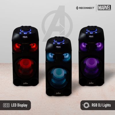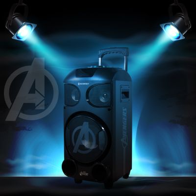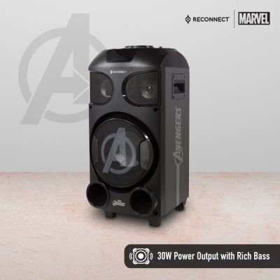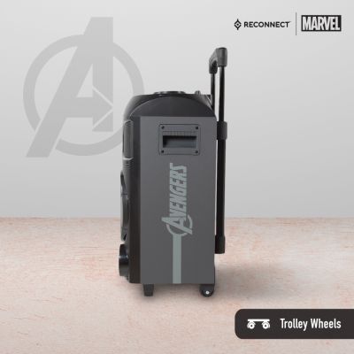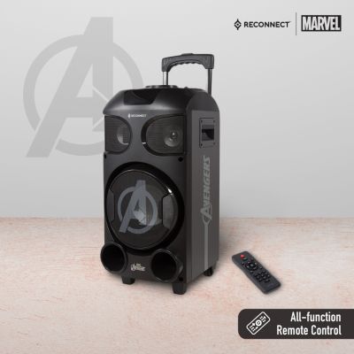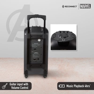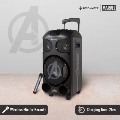 Device Protection Plan AddedReconnect Marvel Avengers 30W Wireless Party Speaker, In built battery for portability, DJ lights super bass & remote control, 4hrs playtime and guitar input, wireless mic for karaoke, comes with trolley and wheels - DPSB101 AV