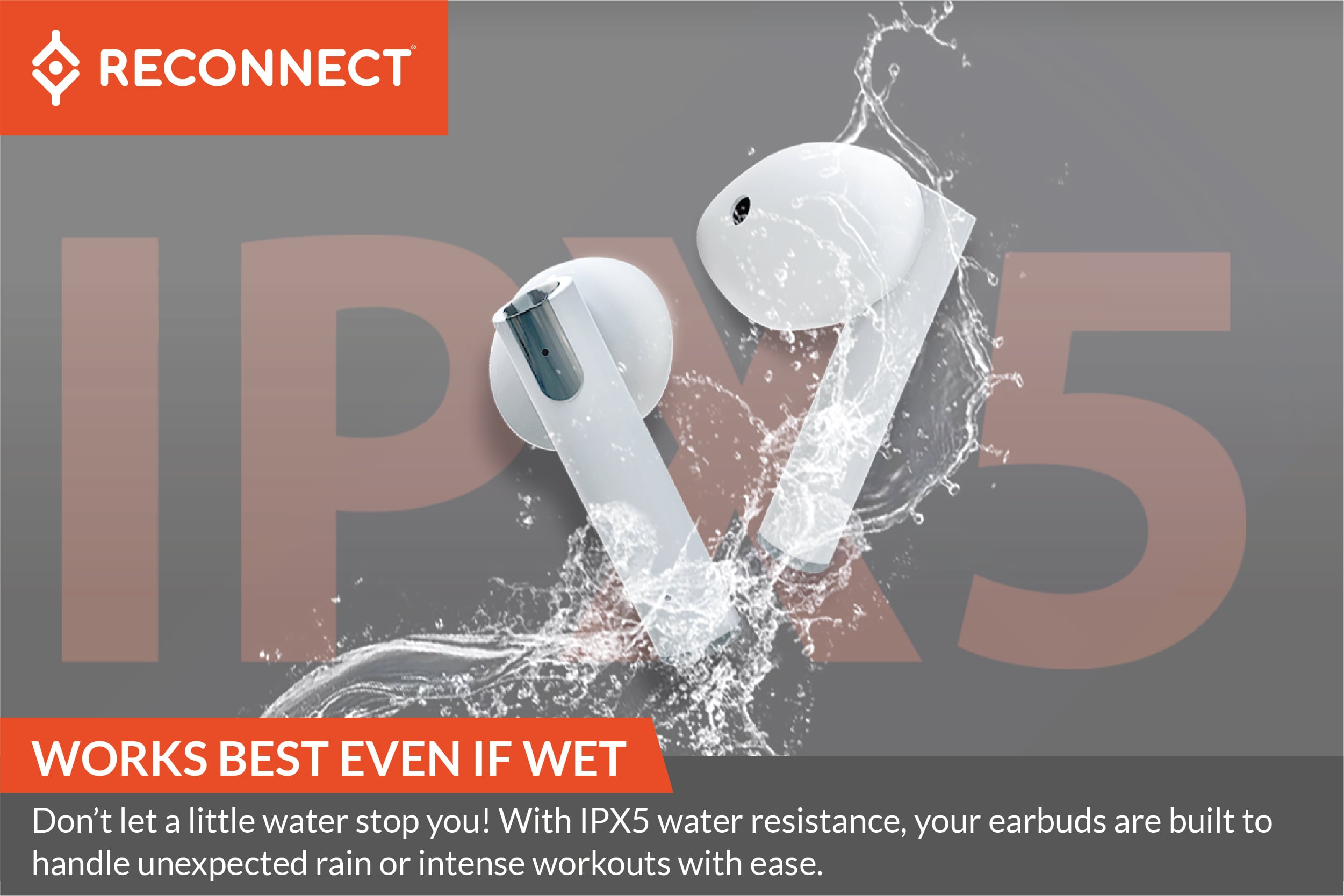 Don't let a little sweat or light rain stop your music. The IPX5 water resistance rating ensures that your earbuds can withstand your active lifestyle, providing protection from accidental water splashes and sweat. Highlight – IPX5, Water Resistant, Sweat Resistant.