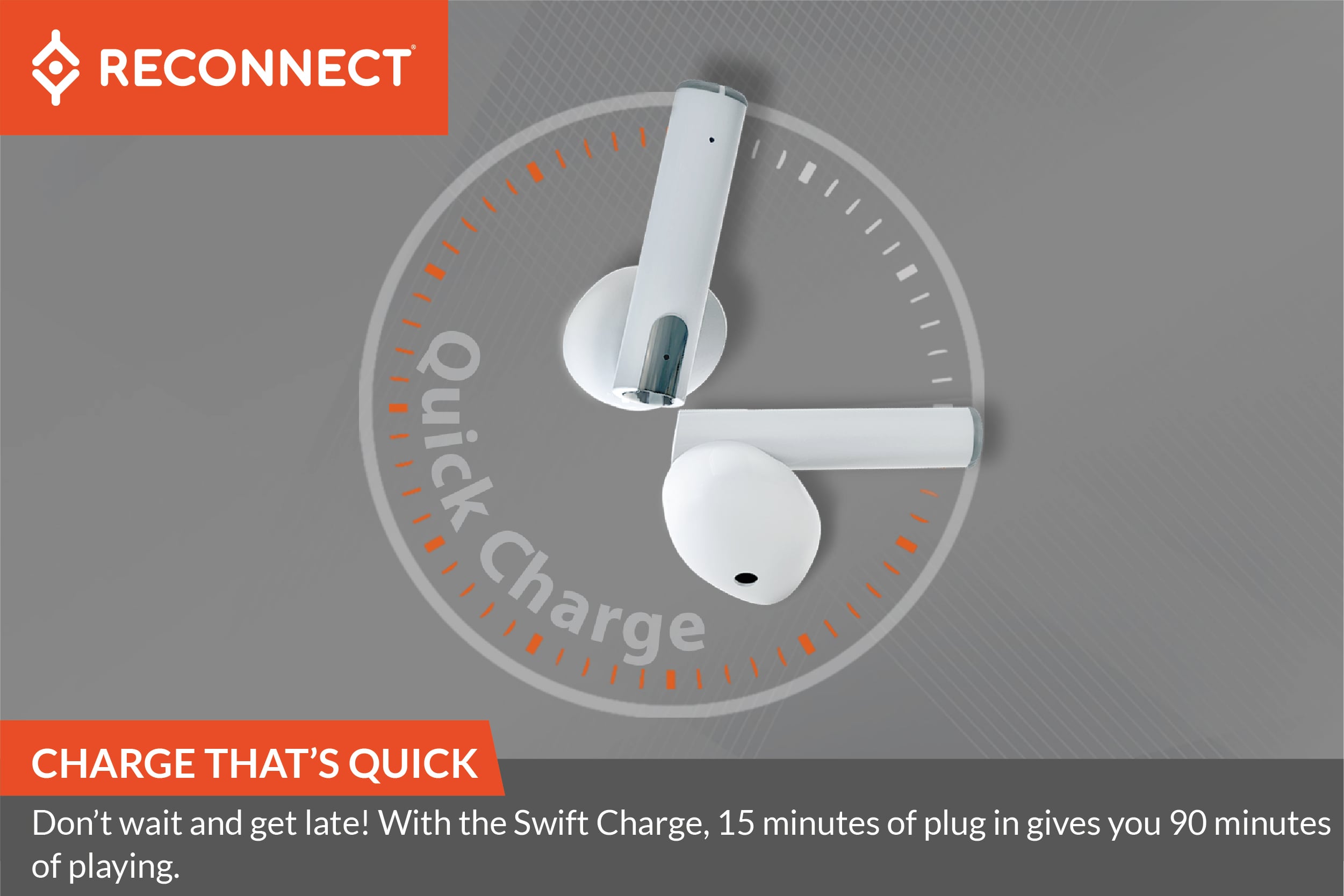 Get back to your music quickly with swift charging. Just 15 minutes of charging time gives you an impressive 90 minutes of uninterrupted playback, keeping the music going when you're on the move.
