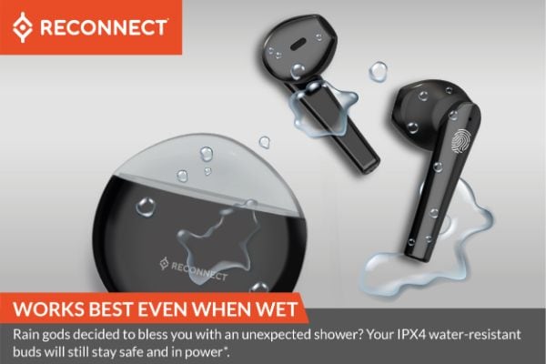 Water Resistant IPX4Now run and listen music in rains without worrying. With an IPX4 water-resistant rating, the Reconnect ProBuds+ can withstand splashes and sweat. Highlight – IPX4, Splash resistant, Sweat resistant
