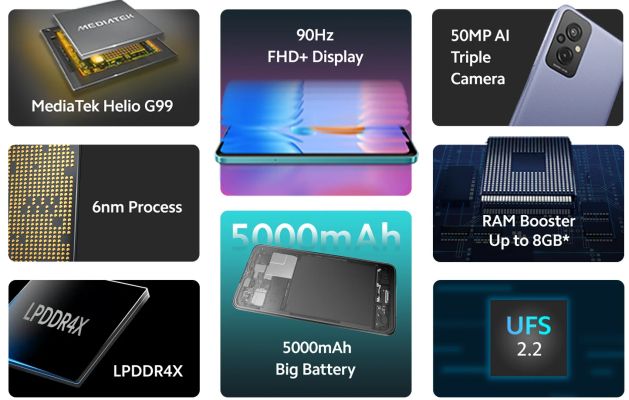 | Key Features | 16.71 cm (6.58 inch) FHD+ Display 4 GB Memory, 64 GB Storage 50 MP +2 MP Primary Camera 8 MP Front Camera 5000 mAh Battery Android 12 Operating System MediaTeK Helio G99 based on 6nm Processor |