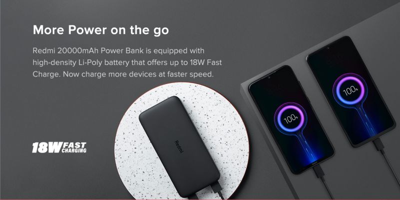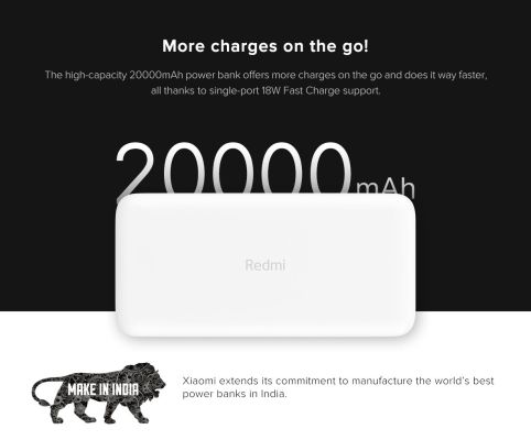 Redmi 20000mAh Li-Polymer Power Bank, USB Type C and Micro USB Ports, 18W Fast Charging, Low Power Mode, White