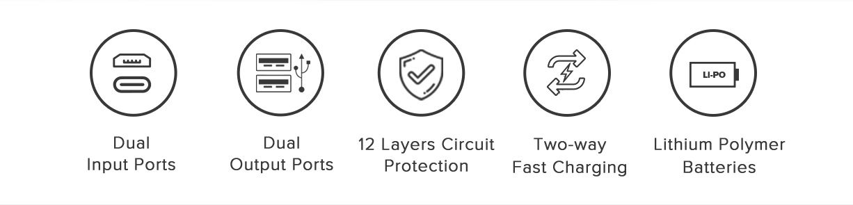| Key Features | Dual Input Ports Dual Output Ports 12 Layers Circuit Protection Two-Way Fast Charging Lithium Polymer Batteries |