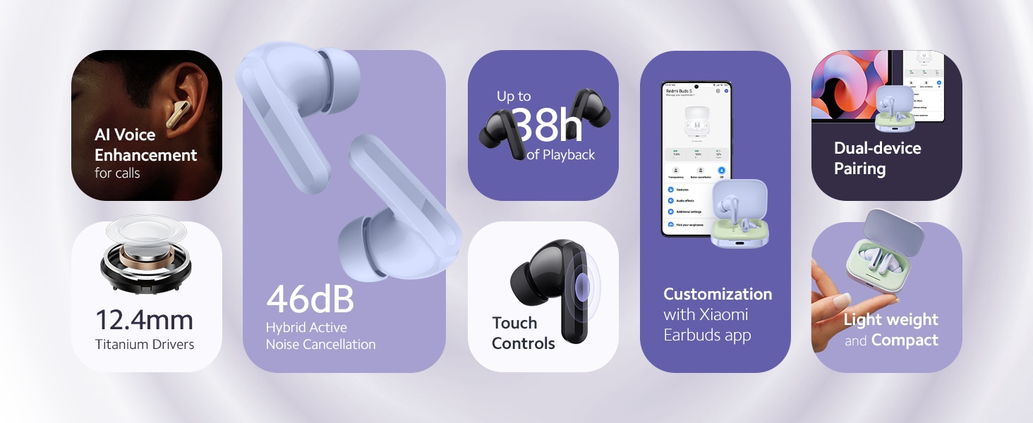Redmi Buds 5 Truly Wireless Bluetooth Ear buds (TWS) with Upto 46 dB Hybrid Noise Cancellation, Dual-Mic AI Call Enhancement, 10 mins for 4 Hours Fast Charging with Upto 38 Hrs Playback, Fusion Purple