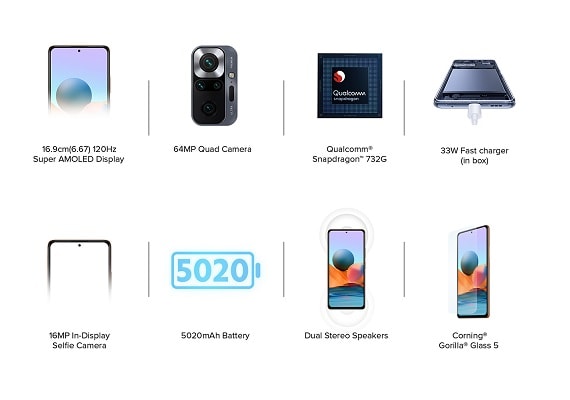| Key Features | 16.9 cm (6.67 inch) FHD+ Super AMOLED Display Qualcomm Snapdragon 732G Processor MIUI 12 based on Android 11 Operating System 64 MP, 5 MP, 8 MP, 2 MP Primary Camera 16 MP In-display Selfie Camera 33W Fast Charger, USB Type-C reversible connector port Triple slot tray, Side-mounted Fingerprint Scanner Splash, Water and Dust Resistant- IP53 Supports dual SIM VoLTE HD calling Dual Stereo Speakers, 3.5mm headphone jack Corning Gorilla Glass 5, 5020mAh Li-Polymer Battery |