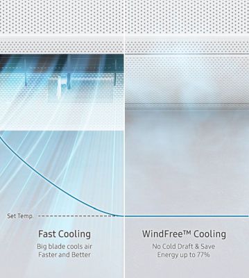 Stay comfortable cool with WindFree Cooling. It gently and quietly disperses air through 23,000 micro air holes, so there is no unpleasant feeling of cold wind on your skin. Its advanced airflow also cools a wider and larger area more evenly. And it uses 77% less energy than Fast Cooling