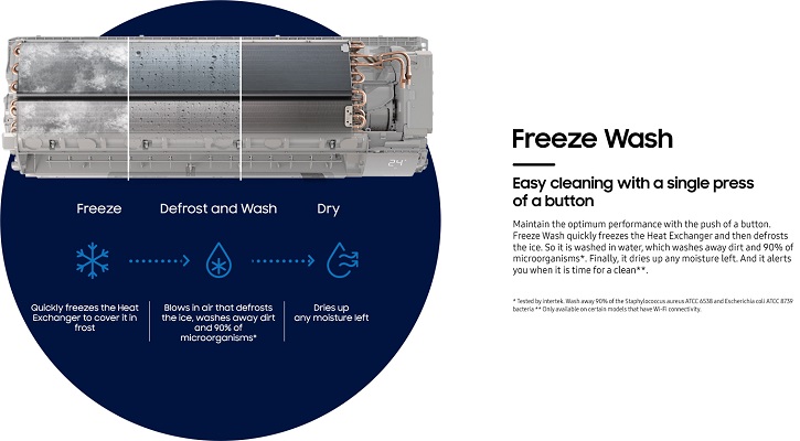 Maintain the optimum performance with the push of a button. Freeze Wash quickly freezes the Heat Exchanger and then defrosts the ice. So it is washed in water, which washes away dirt and 90% of microorganisms. Finally, it dries up any moisture left. And it alerts you when it is time for a clean.