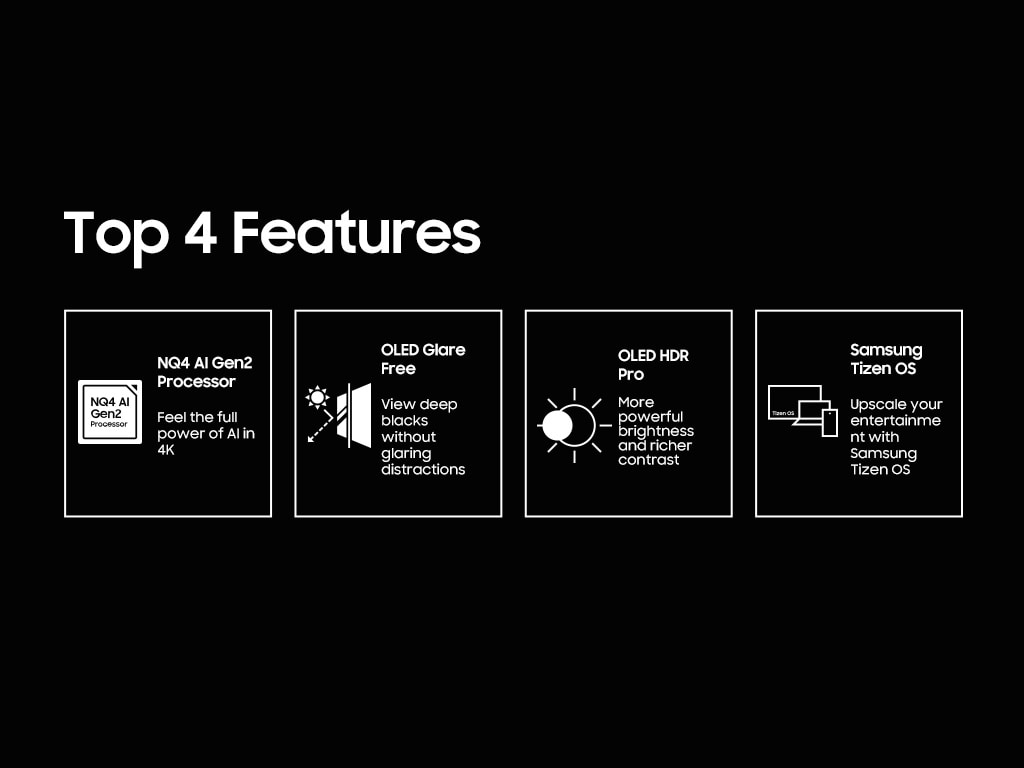 | Key Features | Supported Apps: NetFlix, Prime Video, Samsung TV Plus, Disney + Hotstar Operating System: Tizen Resolution: 3840 x 2160 OLED Connectivity: 4 HDMI and 4 USB Ports Sound Output (RMS): 70 Watt Refresh Rate: 100 Hz (Up to 144 Hz) |