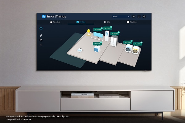 Energy saving is made easy with SmartThings. By turning on AI Energy Mode, your TV auto-detects surrounding light levels and analyzes usage behaviors to adjust the brightness, which helps in reducing overall energy consumption. It also analyzes TV content scene-by-scene to subtly adjust brightness where possible, to cut down on energy consumption