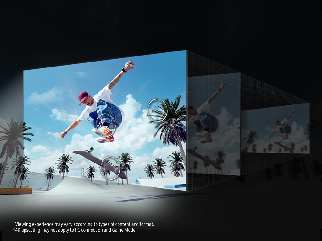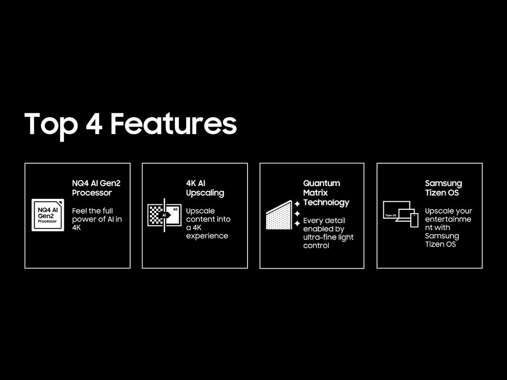 Samsung's AI powered 4K processor creates one of the best 4K experiences. Our 4K AI Upscaling technology powered by 20 AI neural networks transforms content into near 4K picture quality. Our NQ4 AI Gen2 Processor optimizes both picture and sound to deliver a 4K experience whether you are streaming OTT services, playing your favorite video games or watching live sports.