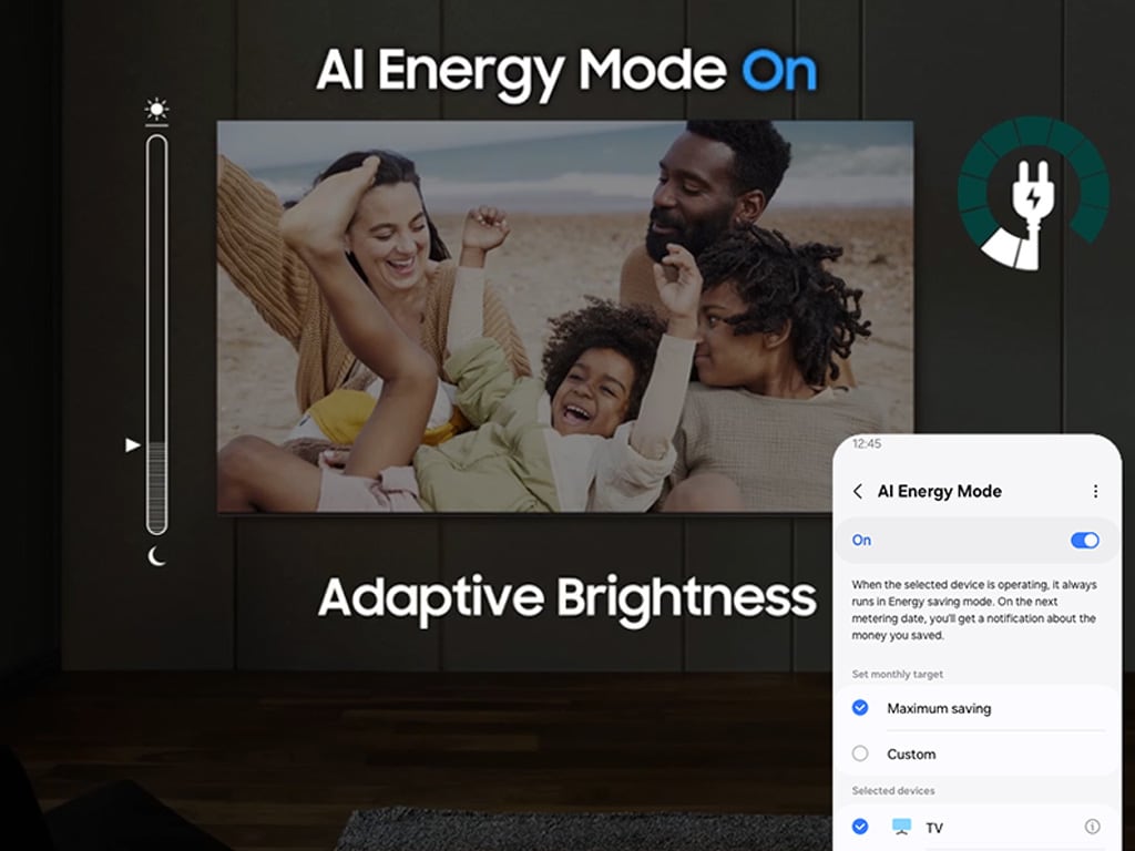Energy saving is made easy with SmartThings. By turning on AI Energy Mode, your TV auto-detects surrounding light levels and analyzes usage behaviors to adjust the brightness, which helps in reducing overall energy consumption. It also analyzes TV content scene-by-scene to subtly adjust brightness where possible, to cut down on energy consumption.