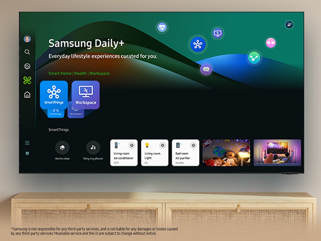 Through Samsung Tizen OS’s open app ecosystem, Daily+ enables you to easily manage your daily activities and lifestyle from the comfort of your TV. Daily+ includes apps and services like SmartThings and Workspace.
