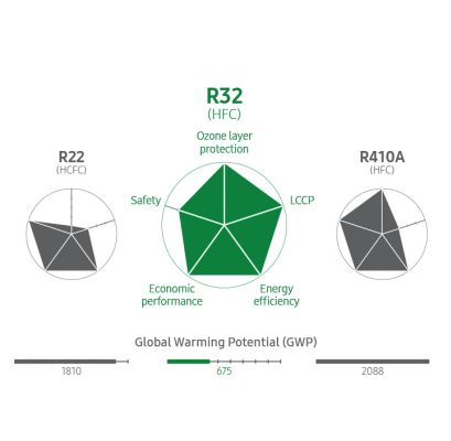 Protect the planet by reducing the impact of climate change. The air conditioner uses the next generation R32 refrigerant, which helps conserve the ozone layer and has a low impact on global warming compared to conventional R22 or R410A refrigerants.