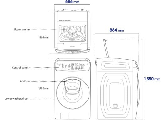 Check the machine dimensions before installation. Be sure that there are no obstructions, such as low-set cabinets or shelving, to the opening of the FlexWash upper washer door.