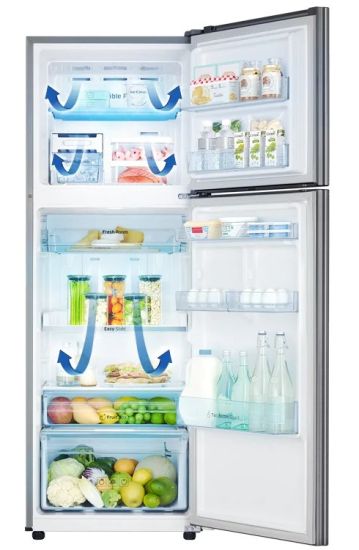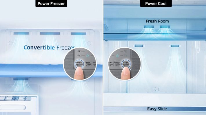 Delivers a rapid cooling performance to preserve food’s freshness, chill drinks and make more ice. At the touch of a button, Power Cool chills food in the fridge 31% faster* and Power Freeze makes ice 31% faster. *Internal testing on RT36FARZASP