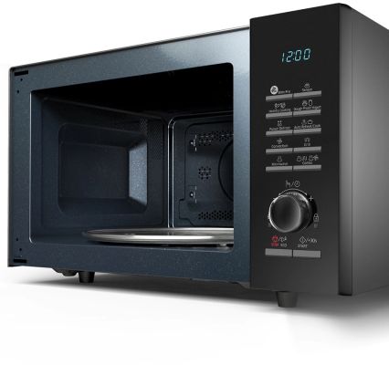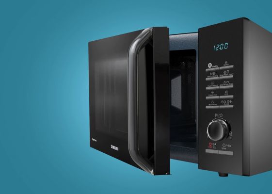 You're looking at the Samsung MC28H5145VK Convection Microwave Oven. Measuring 47.56 cm in depth, 15.7 cm in width and 31 cm in height, this 28-litre microwave oven is suitable for a family of 2 to 4 members and can be placed in the kitchen cabinet or on the countertop. The ventilation holes eliminate any cooking odours, smoke and steam, which keeps the convection microwave oven odour-free. This microwave oven comes with a control panel that offers various settings for a quick cooking experience. You can cook tasty French fries, samosa pockets, veg cutlets and other fried delicacies with the slim fry feature. This technology uses hot air circulation and only a touch of oil is needed to make the food crispy from outside while retaining a moist flavourful texture inside. The Roti and Naan feature button makes perfectly crisp Roti or Naan with just a single touch. It uses the tandoor technology that replicates the tandoor-like conditions with a temperature of up to 200 degrees Celsius. You can enjoy freshly made homemade dough and curd in no time with the curd/dough feature. This feature provides pre-programmed cooking time, and uses the fermentation function which utilises advanced fermentation technology to set just the right temperature. You can prepare soups, dal, pasta, lemon rice and more with the Indian recipe cook feature. This feature offers pre-programmed cooking time for up to 200 popular cuisines, thereby saving on your cooking time. The power defrost feature enables you to defrost meat, poultry, fish or fruits in a short time, thereby retaining their freshness, without making them soggy. The Auto Sensor determines the proper time and power level by detecting the moisture level in the food, which eliminates the need to set the cooking time and power level. Apart from this, you can also bake cakes and grill chicken or vegetables in this microwave. This oven's anti-bacterial and scratch-resistant cavity is easy to maintain. Since the microwave uses radiations to heat food, the door latch prevents these radiations from escaping, thereby safeguarding you from burns and other harmful effects of radiation. This convection microwave oven comes with a child lock feature that locks the control panel to prevent accidental changes in the settings.