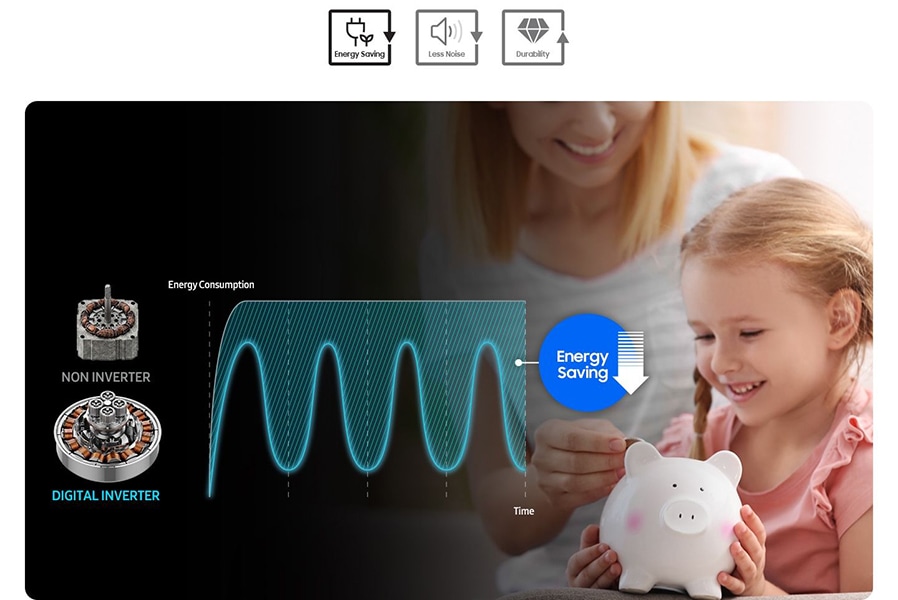 Enjoy long-lasting, powerful performance with less noise and greater energy efficiency - 5 star energy rating. The Digital Inverter Motor uses strong magnets to provide outstanding durability and power.