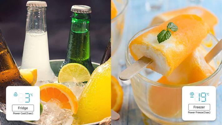 Enjoy a rapid cooling performance. At the touch of a button, Power Cool blows intensely cold air into the fridge to quickly cool your groceries or favorite drinks. And Power Freeze delivers a fast blast of cold air into the freezer. It’s great for freezing or firming up frozen food and making ice.