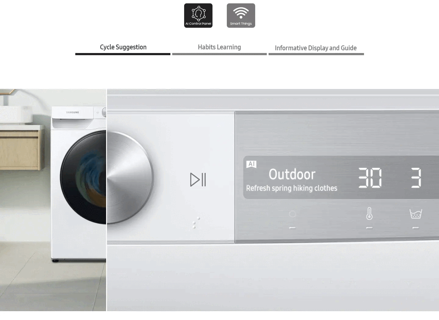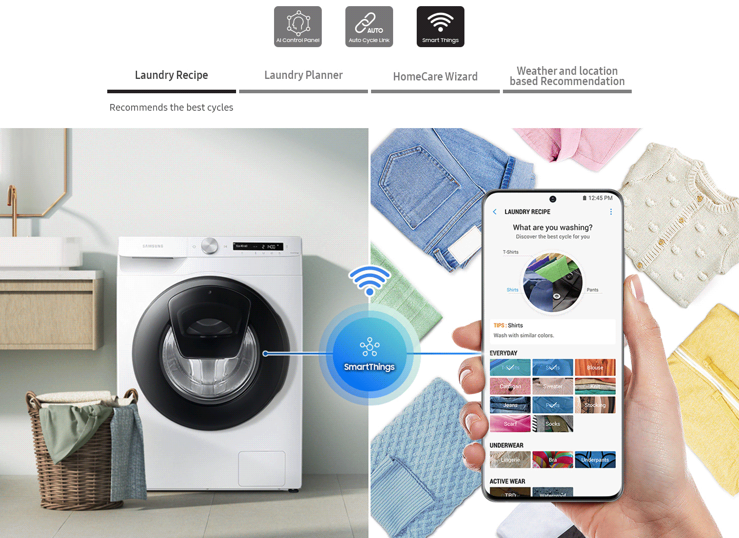 Wash easily and effectively with powerful AI Control. It personalizes washing by remembering your habits, suggesting cycles and displaying timely information. A SmartThings App provides advice on cycles, planning and troubleshooting. And it automatically selects the perfect drying course.