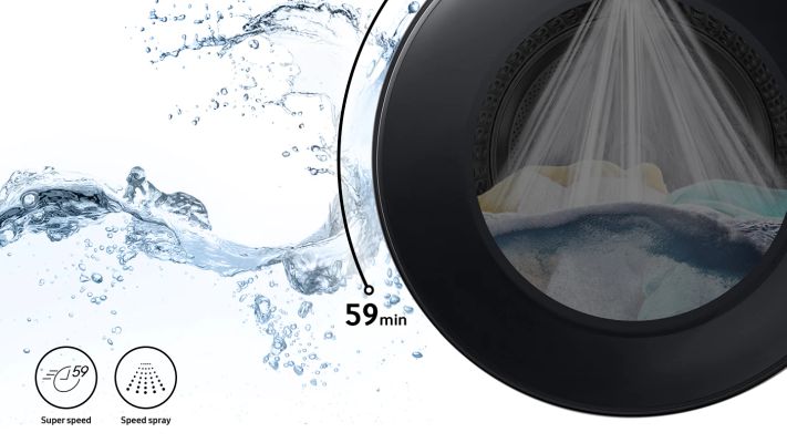 Cut your daily laundry time and get clothes thoroughly clean. Simply use Super Speed to wash a load in just 59 minutes. Eco Bubble technology ensures powerful cleaning, while the rinsing time is shortened using Speed Spray. And it accelerates the spin speed to quickly spin-dry clothes.