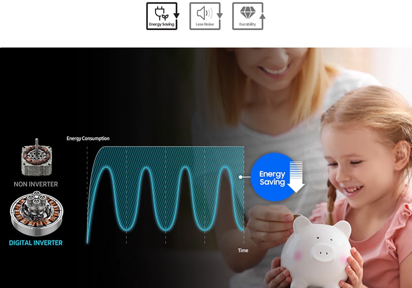 Enjoy long-lasting, powerful performance with less noise and greater energy efficiency - 5 star energy rating. The Digital Inverter Motor uses strong magnets to provide outstanding durability and power.