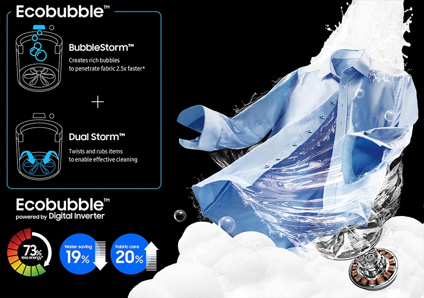 Wash powerfully and more efficiently. Ecobubble with Digital Inverter Technology gets clothes really clean using 73% less energy and 19% less water. BubbleStorm helps detergent penetrate fabric 2.5x faster and gives 20% better fabric care. Dual Storm pulsator creates a vortex of water current that cleans more effectively.