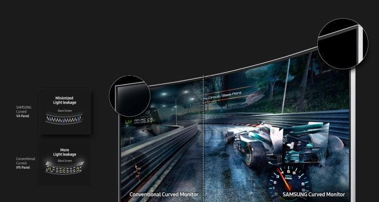 The vertically aligned liquid crystals in Samsung’s VA panels block backlighting more effectively than IPS panels as the screen curves to minimize light leakage and deliver deeper, more uniform blacks from edge to edge.