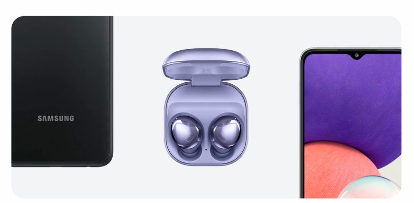 Buds Pro placed in the middle with the case is opened. On the upper left, there is the back of the Galaxy A22 5G and on the lower right, there is the front of the Galaxy A22 5G.
