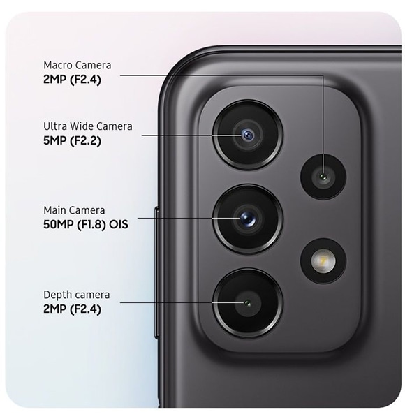 The multi-lens camera on the Galaxy A23 5G takes photos to the next level. Get crisper, clearer shots with the 50 MP OIS Camera, expand your viewing angle with the Ultra Wide Camera, customize focus with the Depth Camera and get closer to details with the Macro Camera.