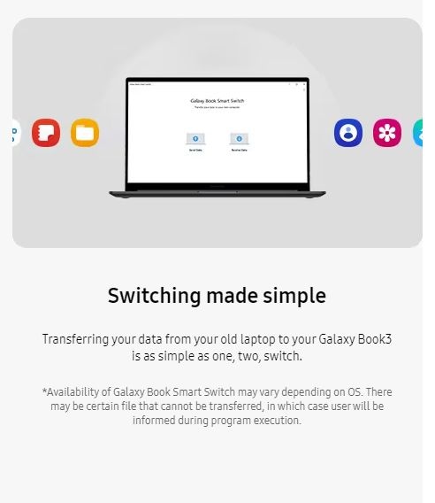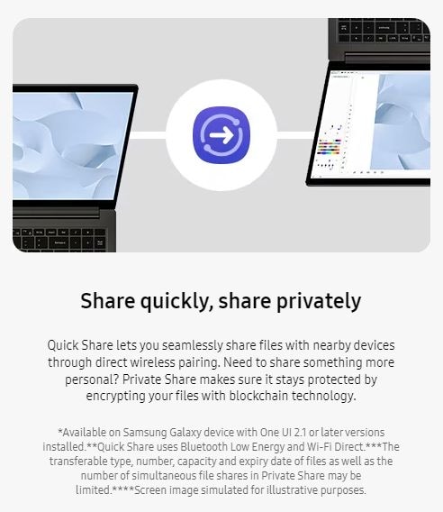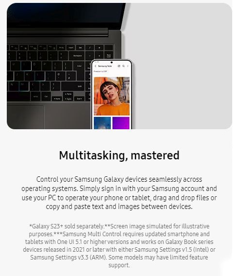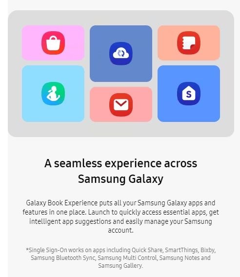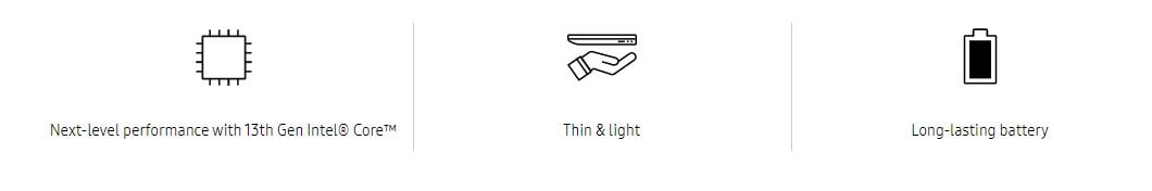 | Included Software | Live Wallpaper, Samsung Gallery, Quick Search, Samsung Flow, Samsung Notes, Samsung Recovery, Samsung Settings, Studio Plus, Samsung Update, Second Screen, Samsung Pass, Quick Share, Private Share, Galaxy Book Experience, Galaxy Book Smart Switch |