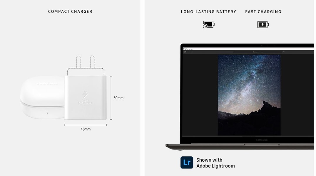 Power through the day's projects with a long-lasting 54Wh (Rated) battery for up to 14 hours of runtime. Then grab a coffee as you top up your laptop with up to 5.2 hours of video runtime in just 30 minutes — with a light and compact charger that even works with all your Samsung Galaxy devices.