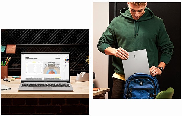 Slimmed down to fit your briefcase with a compact aluminum body that weighs just under 1.6kg, this power-packed laptop is designed to go where you do. Available in Graphite or Silver.