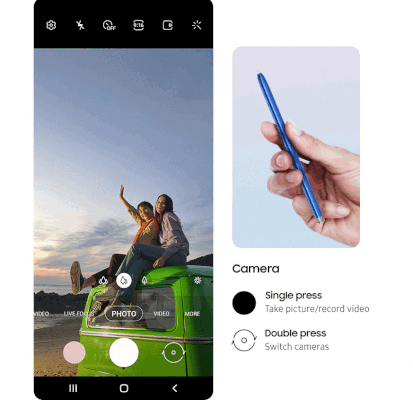 The S Pen harnesses the power of Bluetooth technology, acting as a remote for your Galaxy Note10 Lite. With a simple press or two of the S Pen, you can easily snap photos without having to touch your phone screen, scroll through your photo gallery, or play and pause your music.