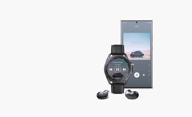 Simply connect Galaxy Watch3 to your compatible Galaxy devices through your Samsung Cloud account. As you go to work or workout, it's quick and easy to go from watch to Galaxy Note20, or from watch to Galaxy Buds Live via Bluetooth.