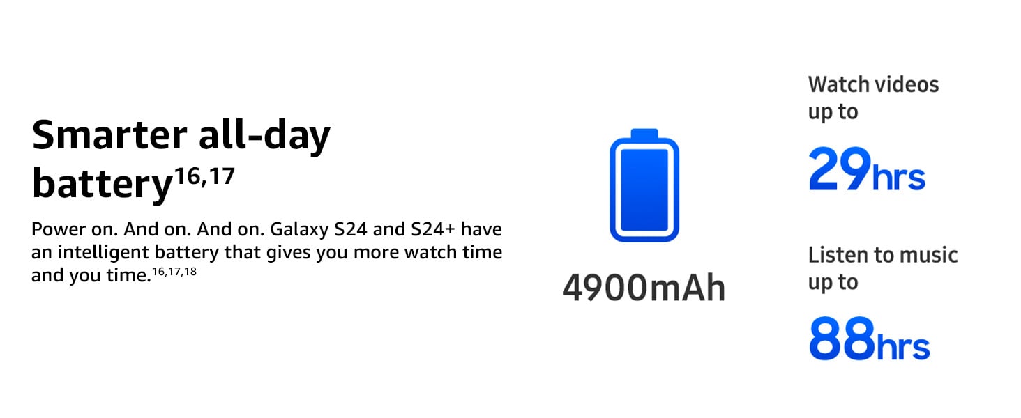 | Battery Run Time | Total Battery Life : 4900 mAh Video Playback Time : Up to 31 hours Internet Usage Time(LTE) : Up to 26 hours Internet Usage Time(LTE) : Up to 27 hours Audio Playback Time (Hours, Wireless) : Up to 92 hours |