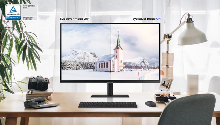 Keep your eyes fresh and strain-free. For those late-night projects, brightness and color temperature adjust automatically for optimization in any environment.With TUV-certified eye care technology, Samsung protects eyes against excessive blue light with eye saver mode and a flicker free feature.