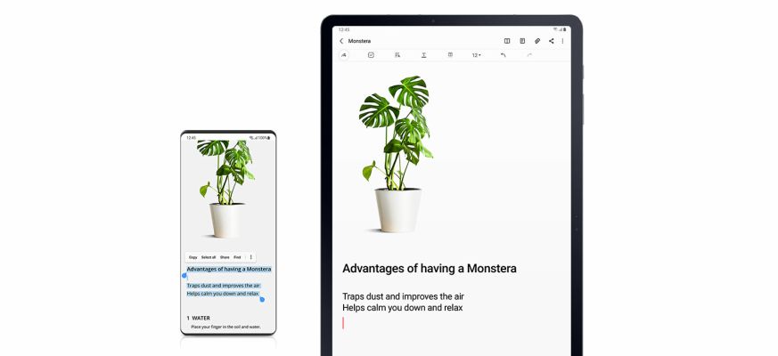 Seamlessly work across devices. You can copy text or an image from your phone and paste it on your tablet, and vice versa. Or write a note to self in Samsung Note or browse on Samsung Internet from your tablet, and open those apps in your phone to pick up where you left off.