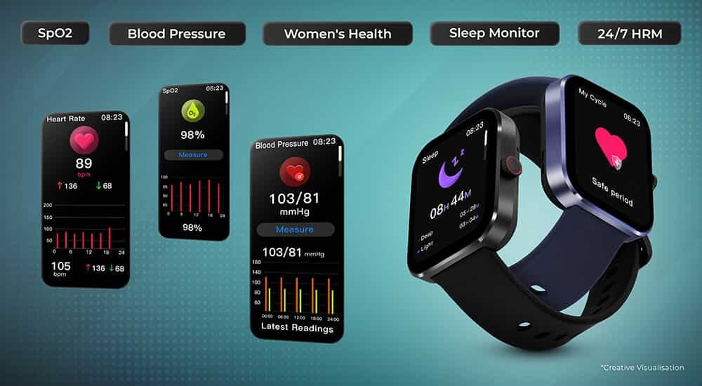 | Features | Sleep Monitor Women’s Health Tracker Animated Watchfaces 100 Plus Watchfaces Activity Tracker Sports Record Voice Recorder Calculator Camera & Music Control Lift To View Screen Time Phone Finder 5 Day Battery Stopwatch & Timer Sedentary Hydration Reminder Breathe |